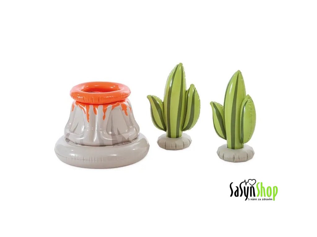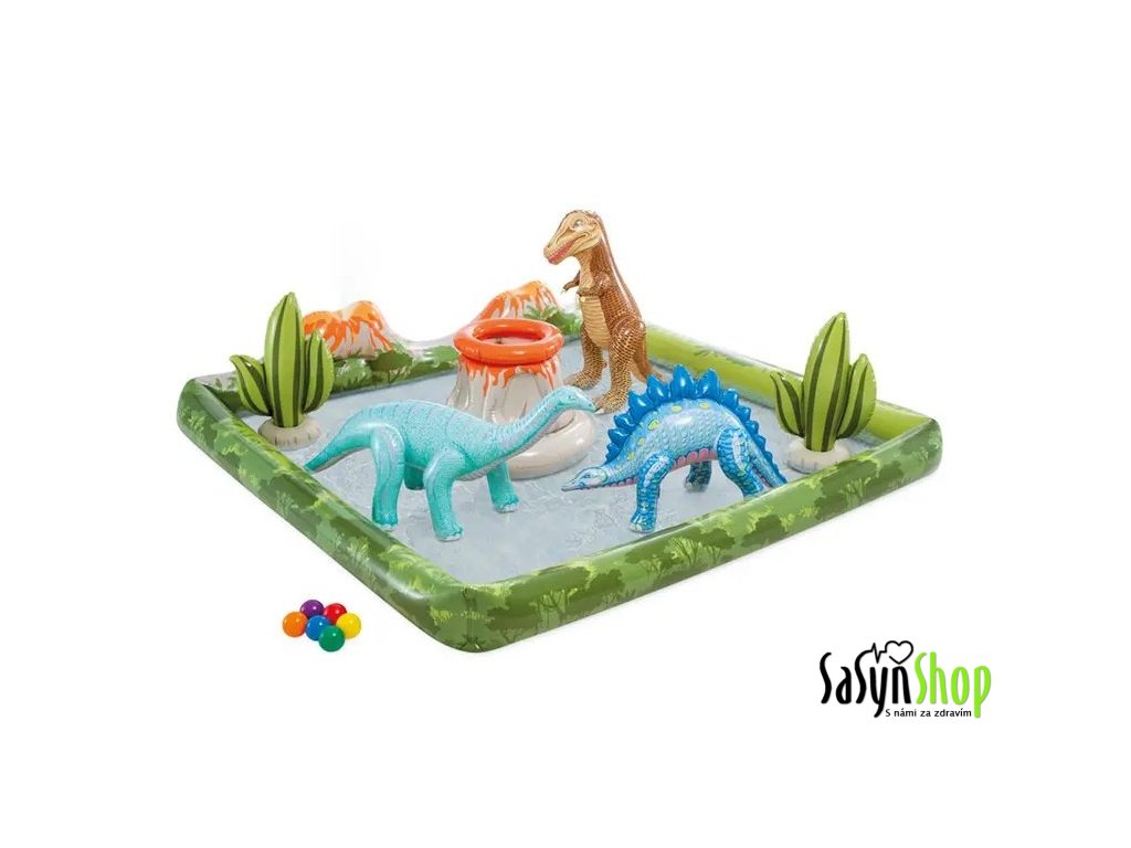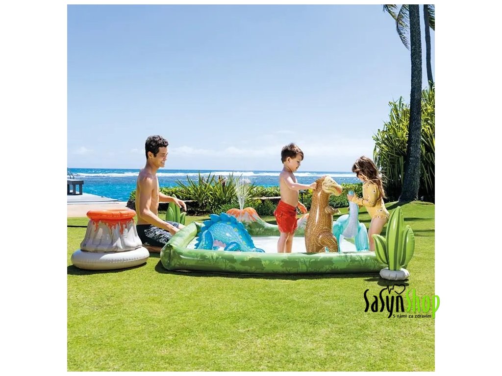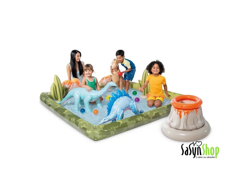Parádní dětský nafukovací vodní koutek Intex Jurassic Adventure, který určitě nadchne všechny malé milovníky vody. Toto nafukovací hrací centrum s motivem Jurského Parku nabízí bazének s nafukovacími dinosaury, obruč na vhazování míčků ve tvaru volkána a ozdobné kaktusy. Součástí balení je samozřejmě i spousta plastových balónků na vhazování do "volkána". Dopřejte si vodní radovánky u vás na zahradě v dinosauřím stylu! Možnost zapojení zahradní hadice pro příležitostnou spršku.
