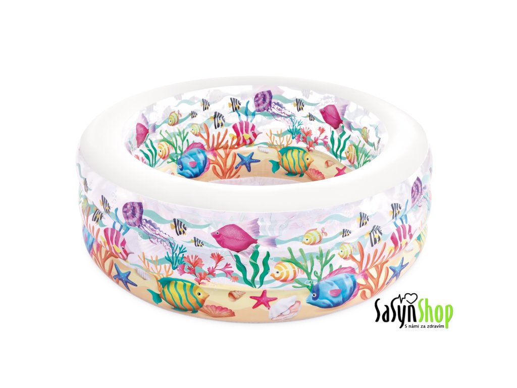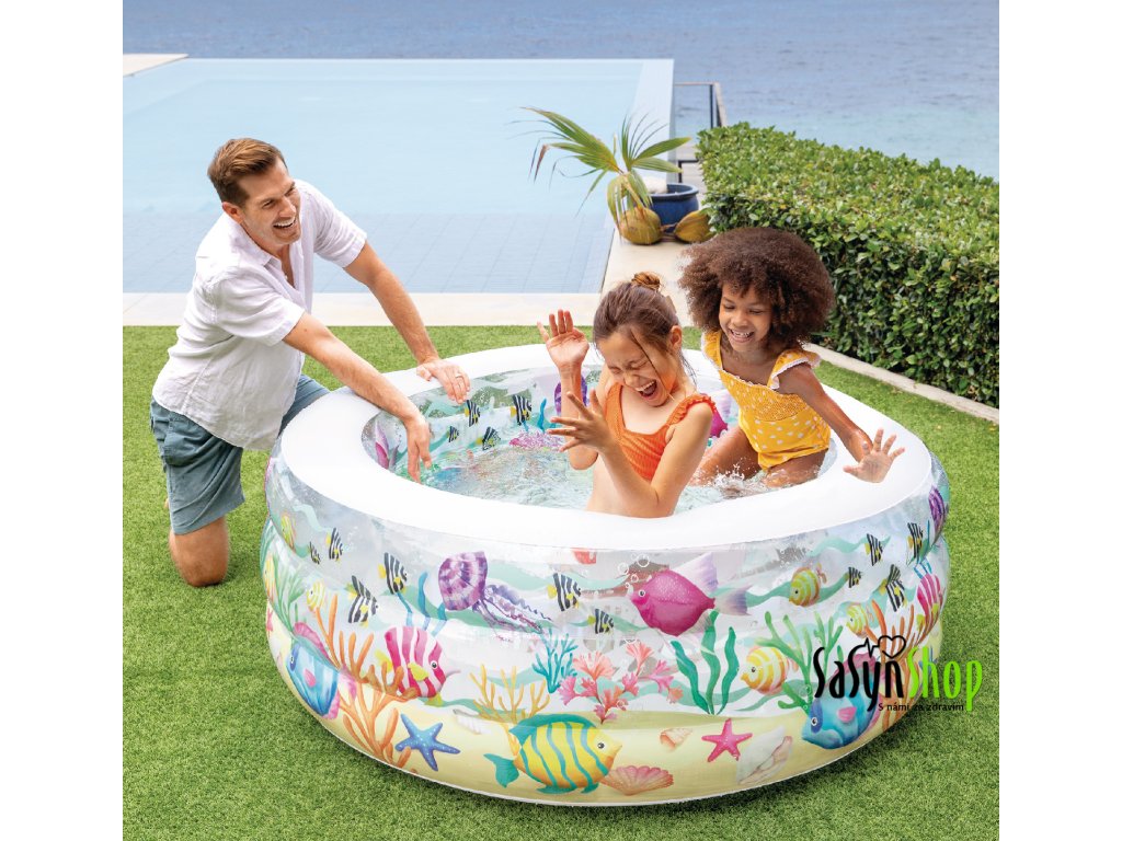 Je nafukovací bazén na zahradu i na podlahu, který udělá radost nejen vašim dětem. Bazén doporučujeme stavět na rovný povrch, díky tomu je dostatečně stabilní a pohodlný. Komfortní měkké dno je vyrobeno z vinylového materiálu 0,3 mm. Do bazénu jde napustit 318 l vody. Rozměr po napuštění bazénu 152 x 56 cm. Barevný motiv působí jako akvárium, je částečně průhledný. Vypouštění bazénu vám usnadní vypouštěcí ventil. Součástí balení je sada pro opravy.