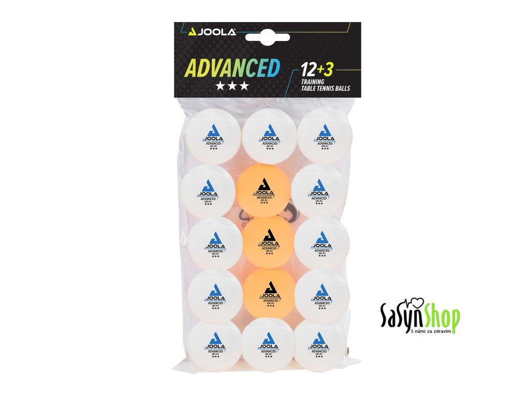 Míčky na stolní tenis JOOLA ADVANCED TRAINING*** jsou optimální pro hráče a kluby, jenž si zakládají na té nejlepší kvalitě při tréninku. Míček na stolní tenis vyrobený z ABS (se švem) se vyznačuje zejména svou vysokou odolností. V sadě naleznete 12 bílých míčků + 3 žluté.