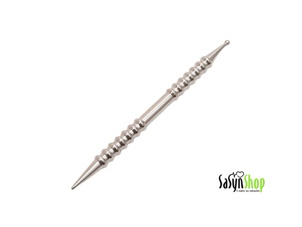 Diagnostická a terapeutická tyčinka SU JOK je nástroj určený pro vyhledávání aktivních bodů a provádění reflexní terapie. Tyčinka je vyrobena z kvalitní chromované oceli a měří 10 cm. Je oboustranná a má vroubkovanou rukojeť pro pohodlný a jistý úchop při práci. Úzký špičatý konec (průměr 1,5 mm) je ideální pro vyhledávání a stimulaci aktivních reflexních bodů. Kulovitý konec (průměr 2,5 mm) je vhodný pro jemnou masáž větších ploch, například na dlaních, chodidlech, uších a dalších reflexních zónách.